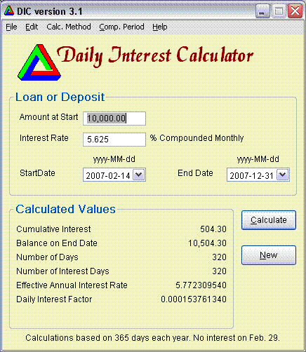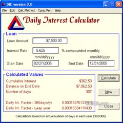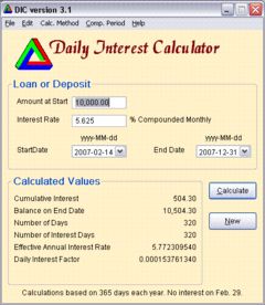 Calculate accumulated daily interest, remaining balance and number of interest days on a loan or deposit over a selectable period. Selectable compounding period. Selectable calculation method, Equivalent Interest Rate Calculator included for determining effective rates anddaily interest factors, nice printouts with or without your own banner, help in compiled HTML format with links to more web based applications. Real freeware. No spyware, adware or viruses. Go to: www.mw-plus.com/dic.html