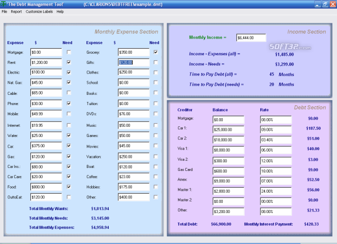 One of the most difficult aspects to get a handle on in your personal finances is determining where all the money went. You generally know the big ticket items like rent or car payment, but it can often be the small expenses that add up to ruin your budget. Debt Management Tool is a simple software application which can help you get a grip on your personal expenses and debt. By filling in your expenses and income you can find out how far you are from breaking even. More importantly you can see where you can cut most easily cut back. There are 30 different expense types you can enter in on a monthly basis. You can also customize the expenses to meet your lifestyle. For example, if you don?t have a child, but go to school, you can change Day Care to Books. You can also individual check off whether you consider an expense a Want or a Need. Now you can enter in your income and play with Wants vs. Needs to see how much you could save each month if you made certain sacrifices. From there you can enter in your loans and interest rates. You can see how quickly you could pay off loans and which loans you would want to pay off first. Similar Software