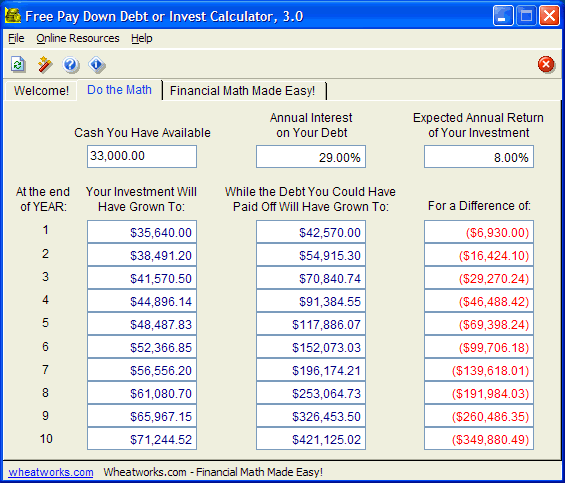 You have some extra cash and wonder whether to pay off debt or to invest it. It's a decision some make without careful consideration. But it has long term consequences. This free calculator shows you the future effects of an investment versus the effects of paying down a current debt. You need only three number: the amount available to invest, the anual interest rate on your current debt, and your investment's annual return.This free financial calculator offers integrated help, provides automatic hints, and offers easy, free, online updates.