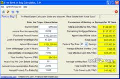 This free real estate calculator for Windows helps you determine whether purchasing a home or renting is your best option. Free Rent or Buy Calculator is a real estate calculator designed for Windows 95, 98, ME, NT, XP and Vista systems. It offers integrated help, provides automatic hints, and offers Wheatworks' integrated Upgrade Center for easy, online updates. Similar Software