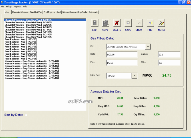 Gas Mileage MPG Tracker is a freeware application which calculates and tracks your fuel usage and miles per gallon average. The program computes both highway and city miles per gallon and automatically averages your gas mileage over the life of your auto. The software calculates statistics for each individual vehicle as well as for multiple vehicles. It compiles stats on specific fill ups as well as stats covering all the fill-ups entered. Data can be entered quickly and easily with most all of the information and a quick browse section all on the main screen. This simple user interface is one of the main advantages of the software. With Gas Mileage Tracker you can record data on multiple cars, trucks, SUVs, motorcycles, boats, and any other type of vehicle. A number of additional MPG and gas mileage stats are tracked like total miles driven, total city and highway miles, average city and highway MPG, total money spent on fuel, and more. There is even a note section where you can write down notes to remind you of any specific details regarding a specific fill-up. This may be unique information like towing a boat, using different octane gasoline, perhaps a different driver, or anything else that you determine may have an impact on your gasoline efficiency. Additional features such as print outs and help are included. There are no time limits or reduced features in this free program. Similar Software