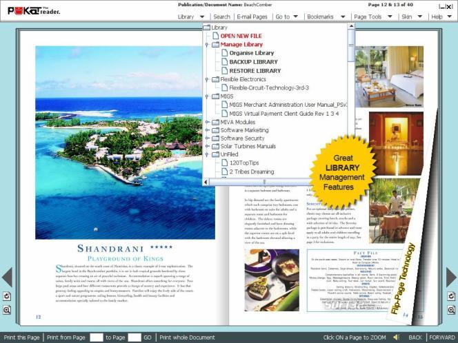 Experience reading PDF files as never before. It's FREE and easy-to-use . The perfect presentation and document management tool... No matter where your PDFs are sitting on your computer, POKATreader automatically adds your files to its Library. Instantly access your pdf files. POKATreader is great for; newsletters, books, reports, documents, magazines, catalogues, product guides, business plans, annual reports, periodicals, journals, legal works... and so much more! FEATURES INCLUDE: [1] Drag and drop a PDF file into POKATreader and the software automatically delivers a new "Flip-Style" reading experience. [2] Auto Library - access all your PDF files from one location.* One-Click library backup. [3] In-Page, One-Click-Zoom. [4] Change Skin (background colour) to suit publication (great for presentations). [5] Goto (specific) page. [6] QUICK print. Similar Software