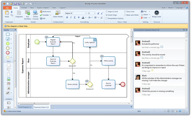 Bizagi BPM Process Modeler is a freeware application that you can download from the Internet and use in a desktop or portable computer. It is very easy to use; in a matter of minutes you will be able to begin defining your processes and collaborate with other people in your organization.