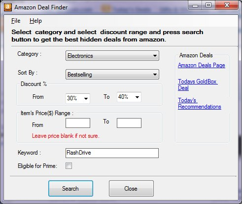 Amazon Deals finder is an Advance search engine for amazon that helps in finding the best deals or discount on Amazon and makes most from your hard earns money. Application makes use of some of the amazon hacks and directs you to amazon web site itself.This software will help user get up to 90% of discount from the listed price.