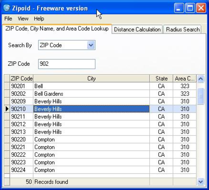 Zipoid is a ZIP Code verification, look-up and distance calculator tool. It contains a database of over 42000 ZIP Codes and is of great assistance to marketing, mail-order, transportation, relocation, shipping and catering companies. Zipoid allows its users to calculate the distance ranges between different ZIP Code locations to estimate transportation costs, check ZIP Codes for validity, look up telephone area codes assigned to various ZIP Code locations, or view the list of all cities and towns located within the specified ZIP Code. Marketers can use the tool for local mail advertising campaigns, since Zipoid automatically identifies all ZIP Codes found within the specified radius. The search can de done by a ZIP Code, City Name, Area Code, or County Name. Zipoid is very easy to use. Program's interface is simple and intuitive. It features only three tabs - Distance Calculation; Radius Search; ZIP Code, City Name and Area Code Lookup. The program does not require any special knowledge or personnel training.