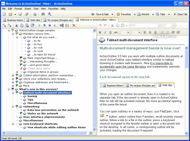 ActionOutline Lite helps you organize your bits of info into the intuitive outline form.The possibilities for its use are practically endless: to-do lists, recipes, project notes, personal contacts, bookmark lists, reports, term papers and more.