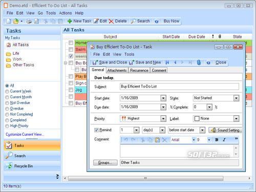 Efficient To-Do List Free is a professional, elegant and handy task management software package. By specifying the priorities or order of to-dos (tasks) or specifying different colors for different task labels, Efficient To-Do List Free makes every effort to assist you in following the "First Things First" principle. It reminds you before a task starts or is due, helps you resist the temptation to "drag on" and brings you the sense of on-time job accomplishment. The product saves you a lot of time with the great features such as quick find, copy and paste of to-dos and bulk import. Besides, there are many other special features such as repeating recurring tasks in multiple modes and so on. Use Efficient To-Do List Free to improve productivity and experience the joys of salary boom and promotions right now! Similar Software
