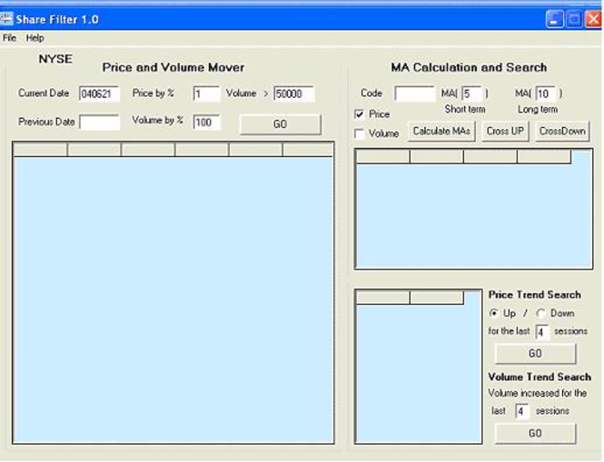 Stock screen freeware, can be used on multi-markets around the world. It is created for start-medium level investors to search for the market movers from thousands of stocks on the market. Features include: price/volume search, moving average calculation and cross over search, price trend search and volume trend search, watch list. (Data files to be downloaded from http://www.sharefilter.com/downloads.htm) Similar Software