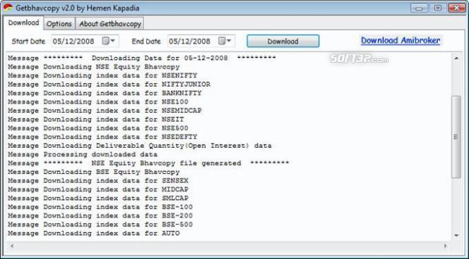 Getbhavcopy is a FREE data downloader for Indian Stock Exchanges, NSE (National Stock Exchange) and BSE (Bombay Stock Exchange).It downloads daily EOD (End Of Day) data as well as historical data (past EOD data) for equities and indices. The data is directly downloaded from NSE and BSE servers and is 100% authentic. The downloaded data can be directly imported into all leading technical analysis software like Metastock and Amibroker.