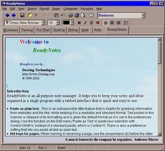 ReadyNotes is a great way to keep all of your thoughts, notes and projects organized in an easy to access and easy to search format.ReadyNotes is useful for storing things like things to do lists, names, numbers and related details, special projects, writings and general thoughts, websites and e-mail addresses (just Ctrl+click on any valid URL, e-mail or Windows directory), lists of books to read and videos to rent, a journal, snippets and stories from websites -- or any kind of information from anywhere!