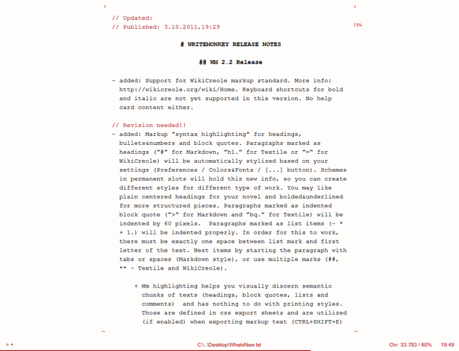 Writemonkey is a writing application with an extremely stripped down user interface, leaving you alone with your thoughts and your words. It is light, fast and free. With an array of innovative tools under the hood and full Markdown support, it helps you write better.This version features new powerful javascript based plugin engine and some ready to use plugins. When officially released, plugins will only be available to existing and future donors.