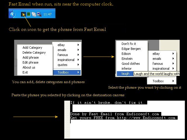 Manage all your frequently used phrases. Paste them directly into most Windows application including Microsoft Office, Emails...The phrases are organized into categories and stored in an easy to access database. Very useful when you reply to lots of emails, eBay emails...and want to reduce the time spent doing this. Similar Software