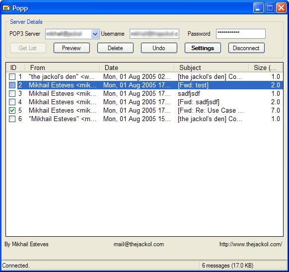 Popp is a small and quick POP3 client that will help you manage multiple POP3 accounts, access them quickly, preview messages and delete multiple messages. Similar Software