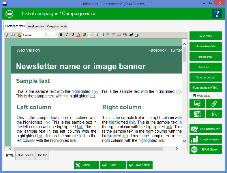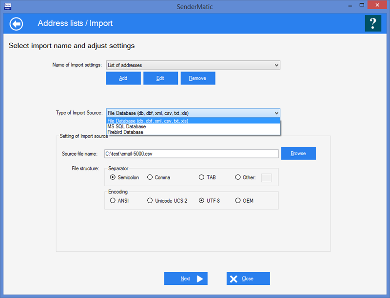 Bulk email sending software for distribution of email newsletters. Incorporates a feature allowing customers to automatically unsubscribe from a list of recipients. Powerful SQL database giving you the ability to manage your email marketing campaigns on a computer network. Available in three versions to suit your particular requirements: Free, Professional and Enterprise. Program is available for download for two types of databases: Firebird or Microsoft SQL Server.Features: