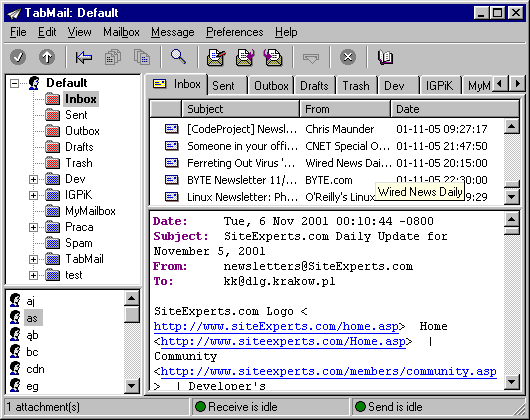 TabMail for Windows (95/98/Me/NT/2000/XP) is mail user agent (MUA) for sending, receiving and managing your email messages. It's small and fast, conforms Internet Standards and supports Unicode characters.Some other properties: