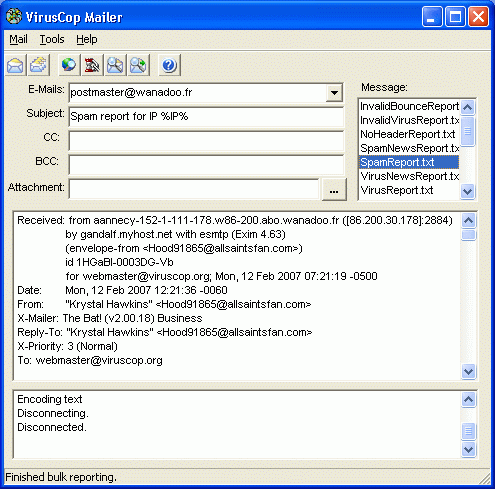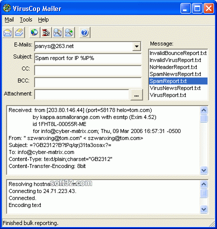 VirusCop is a simple freeware Windows program for reporting virus spam, erroneous e-mail bounces and other spam. It allows you to paste in the headers from virus spam and the relevant ISP e-mail contacts. If you prefer, VirusCop can even automatically find the email complaint contacts for you. There is also a bulk reporting feature to automatically send spam reports for large amounts of spam. VirusCop works in conjunction with SpamAssassin, automatically removing SpamAssassin headers before reporting. Spam that cannot be reported can be forwarded to another spam reporting service like SpamCop. Multiple SpamCop reporting links can be conveniently launched from the VirusCop reporting window. The many included complaint messages can be easily edited to suit your particular tastes. Similar Software