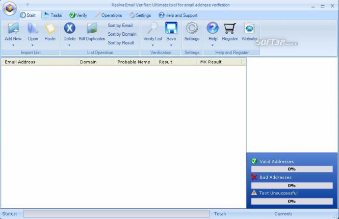 This FREE software checks for existence of an email address. It verifies / validates email addresses in a list, removes invalid entries and clean the list. Performs three levels of verification - syntax level,domain level and server level with a high speed multithreaded engine. Use this tool first before sending emails to a huge list to reduce bounce back rate and save your smtp server from getting blacklisted. Only verifer in the market which works even when port 25 is blocked.Most verifier does not work due to port blokage. Vodamail Email Verifier uses different ports for validating email address. This features makes it the only available working Email Verifier in market.