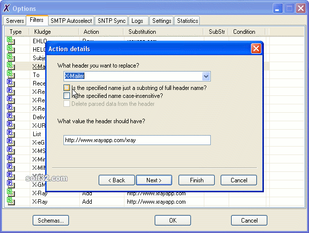 X-Ray is an email header filter and POP/SMTP server switching tool. It runs as a local POP/SMTP relay server and scans your incoming and/or outgoing mail for user specified mail headers. Once it finds a match it can change the header, remove it, replace it or perform some other special modifications. In addition, the program allows you to set up multiple profiles for POP and SMTP servers and switch between them from the system tray. X-Ray can also run as an NT service. Similar Software
