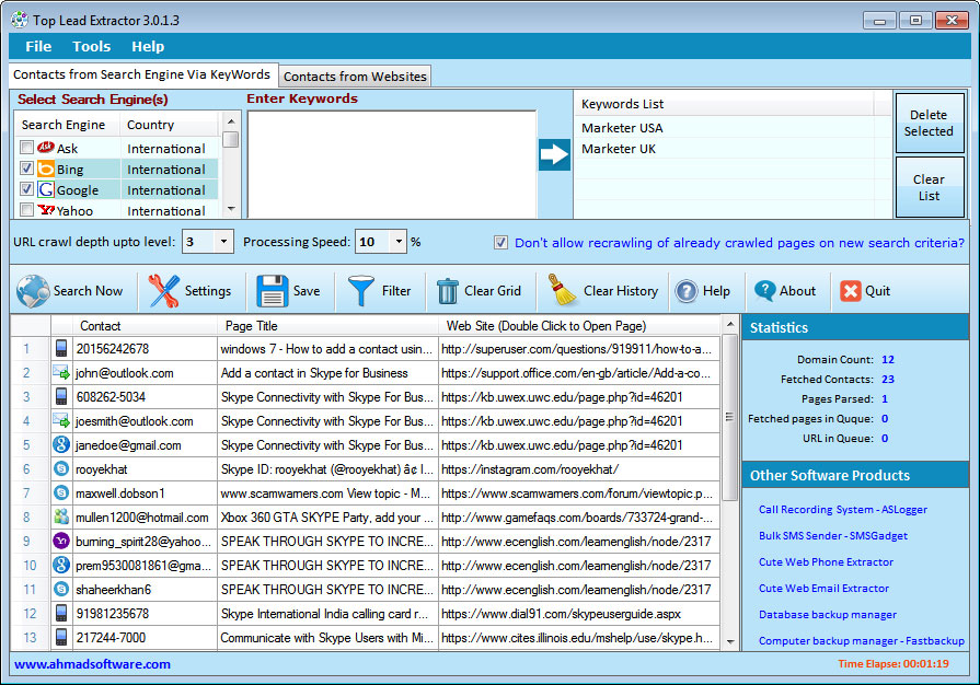 Top Lead Extractor is an easy-to-use, fast and result-oriented contact(i.e. email, Phone, Skype, MSN, AOL, Yahoo, and ICQ IDs) extractor software. It extracts your targeted customer's contact information from your selected search engines like Bing, Google, Yahoo, Ask, Yandex, Baidu, Mail RU, Rambler, and targeted websites list.Key Features: