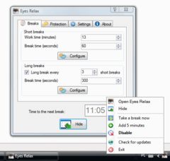 It is an utility that helps avoiding eyes-related problems when working at a computer for several hours. Concentrating your eyesight on a computer screen can cause an eye strain. You can prevent this by taking regular breaks during the work and look at distant objects.Eyes Relax is a tool that reminds you about taking those breaks. It a very flexible utility, which allows you to specify two independent (short and long) work periods, the length of the breaks, break types, notification sounds and many other settings.