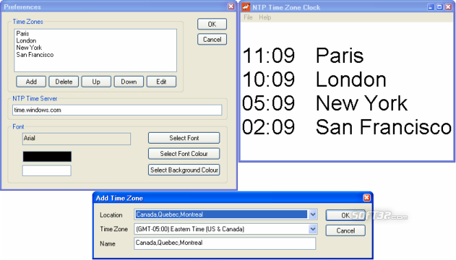 Running on your PC this NTP Time Zone Clock will show you the local time of over 300 cities around the world. Simply select the cities you want to display the local time and they will be displayed on your desktop. With this NTP Time Zone Clock you will always know the local time in New York, London, Frankfurt, Hong Kong, Tokyo or any city you require anywhere in the world. You can edit the look of this NTP clock to suit your preferences. It is simple and easy to use. Similar Software