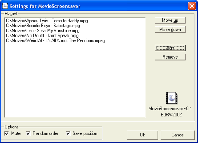 A screensaver that plays any movie using Mediaplayer, with mute, random order, save position options and a playlist. Microsoft Mediaplayer must be installed fot the screensaver to work. Has some difficulties with displaying the movie on Windows NT and Windows 2000 but works perfect on Windows95/98/ME and Windows XP. Similar Software