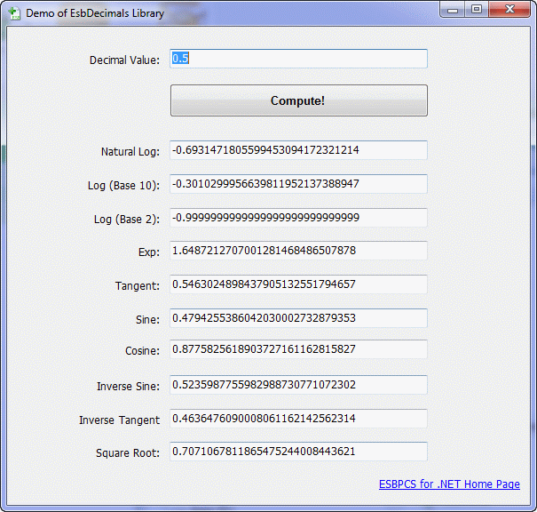 EsbDecimals is a free subset of the forthcoming ESBPCS for .NET - it includes Microsoft .NET Framework Assembly (v2.0, v3.0, v3.5 and v4.0 included) that have classes that supply Constants and Mathematical Routines for the Decimal Type supplied by the Framework.Full C# source is included as well as a Documentation.