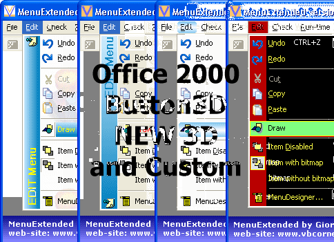 Menu Creator (VB6 Add-in) and Menu Extended expand your creativity to make advanced 'dream' menu! Features: You can create, import and save yours menu easy! - 5 menu styles: Button 3D, Office 97-2000, XP, 2003 e NEW3D. - custom separator - gradient selection bar For EACH ITEM you can add: - image - description - custom color For EACH POPUP menu: - image background - side-bar with: - text + image - aligned/rotated text - gradient colors more... Note that all menu style is customizable! The final touch is give by the Menu Designer (MenuExtended)! While you run your program, you can open the Menu Designer where you can set ALL properties easy, simply with click. WARNING! You don't need to write code!!!!! Nothing!!!! With Menu Creator, Menu Extended & Menu Designer you can transform your application and give, to end user, programs with a fantastic look! Finally, if you want, you can provide the Menu Designer at yours end users. Therefore their can customize the menu as like their want! - Menu Creator is provide with 2 languages (english and italian) and Whats'is Help - Menu Designer is provide with 12 languages - Compatible with Windows 98/Me/2000/XP - Menu Creator, Menu Extended & Menu Designer is provide with complete HTML Help file - Flash format tutorial is available for Menu Creator on my web site Visit my web site for free VB projects and updates: web site English version: - http://www.vbcorner.net/eng web site Italian version: - http://www.vbcorner.net/ Similar Software
