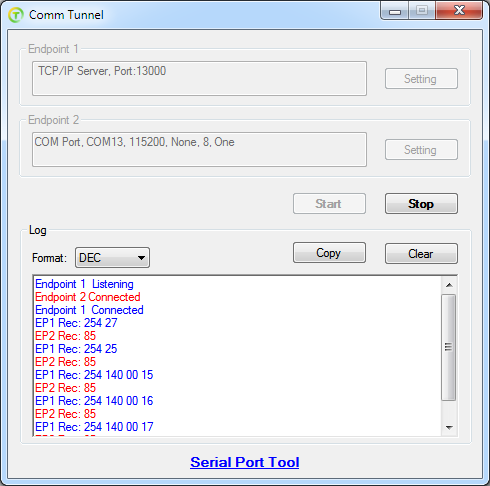 Comm Tunnel is a free tool to connect endpoints. It builds a tunnel between endpoints. The endpoints can be any of serial port, TCP/IP server, TCP/IP client or UDP. The data received on one endpoint will be forward to anther fourt endpoints. It displays data in text, hex and decimal format.