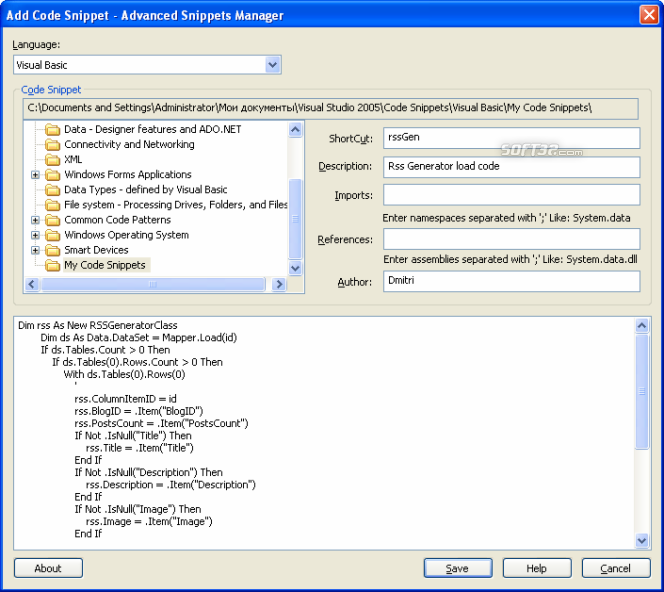 Code Snippets is set of adjustable templates of a code which Visual Studio allows to insert into the user code via input of short aliases. Standard Code Snippets Manager for Visual Studio - the convenient tool that allows effortless familiarization with available code snippets. However, it disallowes creating the new or editing the existing templates. Also, it’s impossible to preview the snippet content before inserting. Considering these limitations, Software Development Innovations released the Advanced Code Snippets Manager, the tools that removes existing restrictions. Advanced Code Snippets Manager is free yet powerful plug-in for Visual Studio, which expands standard functionality of Code Snippets Manager. With its help you can create new and edit existing code snippets, and will be able to preview snippet content with only a few mouse clicks. Similar Software
