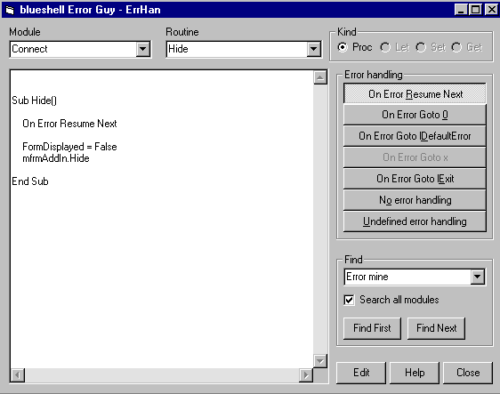 blueshell Error Guy : you really need it!If you have any calls to user-defined functions or subs in your code (have you ever seen another program?), you need to be very aware of this feature of Visual Basic's error handlers; it can cause control to unexpectedly jump into your calling procedure's error handler. And if there isn't a calling procedure (as in all event handler subs like Form_Load, OK_Click etc.) your application will abort immediately. For this reason, we can only recommend that you include an error handler in at least every event handler procedure in your application. This may seem like a lot of work, and it definitely increases the size of your code, but the alternative is worse.