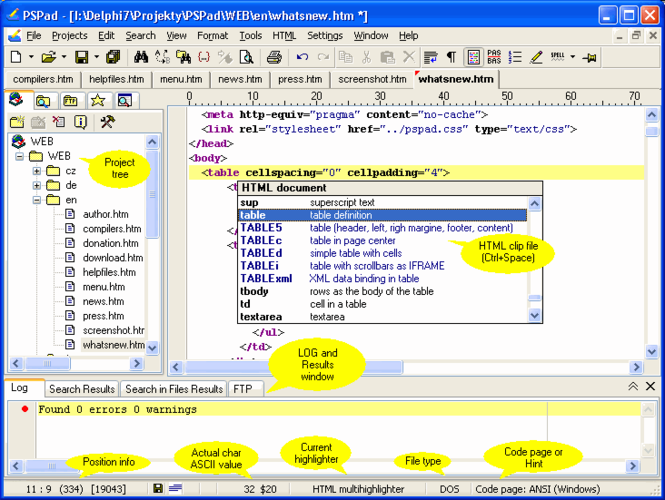 PSPad editor is a programmers editor with support for multiple syntax highlighting profiles. It comes with a hex editor, CP conversion, text differences, templates, macros, spellcheck option, auto-completion, Code Explorer and much more. The program is pre-configured for the most popular programming languages (VB, C++, SQL, PHP, ASP, Python etc.) and you can further customize the syntax settings. PSPad includes several additional tools that are especially useful for HTML editing (compress, format code) and also integrates TopStyle Lite and TidyHTML. The program can be used as IDE for any compiler. Additional features include support for project, file browsing, custom shortcuts, built-in FTP client to edit files on the server and much more.
