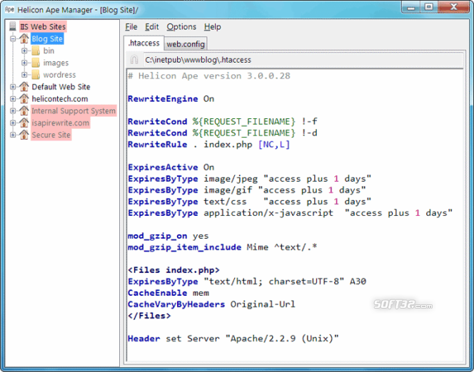 Apache emulator for IIS 7. Implements .htaccess configurations inside IIS. Includes following modules: mod_rewrite, mod_proxy, mod_auth, mod_gzip, mod_headers, mod_cache, mod_expires, mod_developer, mod_replace, mod_so, mod_speling, mod_usertrack and others. 35+ total modules available. Free version of Ape allows installation on up to three web sites on server at no cost. No time or feature limitations. Features: - powerful Apache-compatible URL rewriting; - compatible with Apache modules configuration; - extensive forward and reverse proxy instruments; - comprehensive authorization capabilities not bound to Windows accounts; - flexible and powerful content compression functions; - all-round HTTP-level web developer toolset; - lighting fast server and client cache features; - hotlink (content leeching) protection; - Search Engine Optimization functions; - on-the-fly content altering. Benefits: - users can move their Apache web sites to IIS without modification; - user-friendly interface and plain text configurations (no XML!); - unprecedented compatibility with PHP-based applications; - per-site installation without hosting administration involvement/assistance; - current PHP and many other Unix-style web applications can be easily configured for IIS; - flexible user permissions control (as they are implemented in Apache); - reverse and forward proxy features available for your web server; - low level controls over web site behavior, optimization, security and performance; - protection from DOS and injection attacks. Similar Software