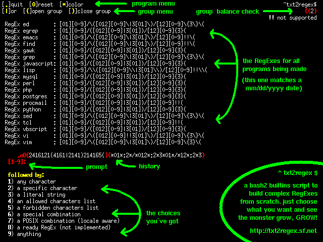Txt2regex is a Regular Expression wizard that converts human sentences to regexes. In a simple interactive interface, you just answer to questions and build your own regex for a large variety of softwares and programming languages: AWK, ed, egrep, Emacs, expect, find, gawk, grep, lex, lisp, mawk, MySQL, OpenOffice.org, Perl, PHP, Postgres, Procmail, Python, SED, Tcl, VBscript, VI, Vim. Translated to 10 languages, it also supports POSIX classes.