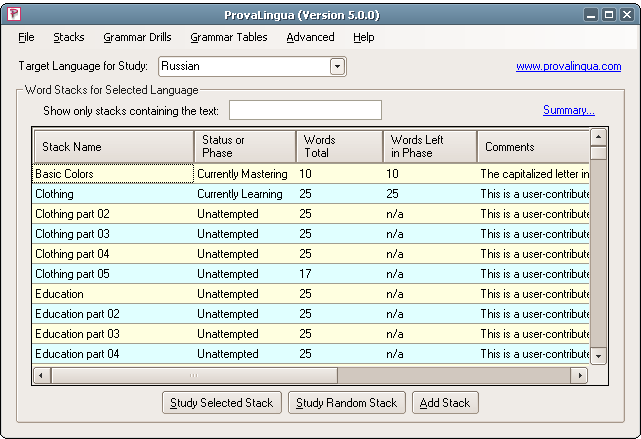 ProvaLingua is a language drill system that can be used for any language. Both vocabulary and grammar drills are included, as well as "learn while you work" tickers, a matching game, and a reading practice tool.Any language may be used, but the software includes word sets for French, Italian, Latin, Portuguese, Russian and Spanish, plus a set for GRE (Graduate Record Examination) study. Grammar tools are available for French, Italian, Latin, Russian and Spanish. It runs on Windows, Linux or Mac OS X.