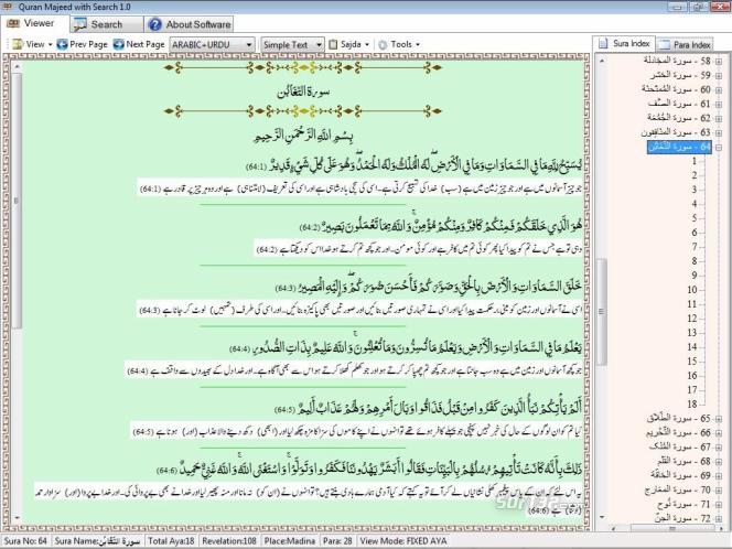 Quran Majeed with Search is used to read the Holy Quran in Arabic, Urdu and English Languages with different Navigation styles. It also has 114 Suras and 30 Paras hierarchal Index from there you can directly access any Sura or Aya, you can change the language font and can search in Urdu Translation (Molana Fateh Muhammad Jalandhari) and English Translation (Abdullah Yusuf Ali).Sura Index: