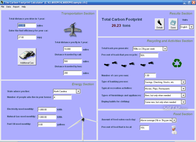 Carbon Footprint Calculator is a freeware application programmed to help in calculating your carbon footprint. The total CO2 number is based on your specific lifestyle habits and daily activities which you enter into the program. One area you fill out is energy use including fuel oil, natural gas, and electric usage. You also fill in the state so we can figure on how that state generates its power. Anther area is transportation such as car, bus, train, and airplane. You can enter in a number of vehicles and the mile per gallon for each, if needed. Next you enter your recycling habits, where you get your food, recreational activities, and more. All of this data is used to give an estimate on your carbon footprint. Once you have filled out the main screen the software gives you your total carbon dioxide output for one year. You can compare this to the rest of the world and the United States. You can also look at the detailed data to find ways and areas where you can best reduce your emissions and make an impact in lowering your overall carbon footprint. Other features include multiple cars, files, details, English and metric units, and help. The software is free with no time limits or feature restrictions. Similar Software
