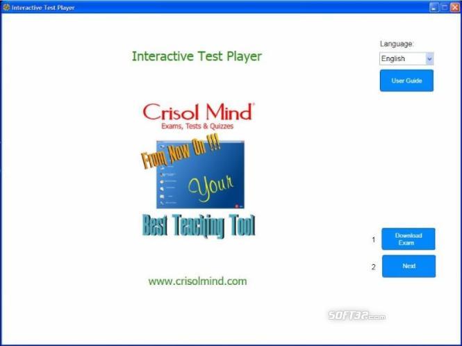 Crisol Mind Test Player executes the exams generated by Crisol Mind Web Pro 2010. Once you get the exam link sent by your teacher or professor, open the Crisol Mind Test Player 2010 application, and on the first page it will ask for the exam link, load it, and you are ready to answer your exam. Crisol Mind Test Player can execute four different types of interactive exams: Evaluation, Simulation, Learning mode and Study guide. The questions will be presented over a visual template, defined by the teacher during the exam generation. The student can answer the questions interactively and navigate between questions. The questions can be of eight different types. The exam can have a time limit, an expiration date or time (range of dates or time). At the end of the exam, the answers will be automatically transmitted to a CrisolMind website (or a personal web directory), and from this location can be collected by the Crisol Mind Web Pro 2010 software, installed in the teacher computer. This way, the grades of the students will be placed in the group grade book. The user interface, the dialogs and messages of the application can be configured to be displayed in different languages: English or Spanish. Similar Software