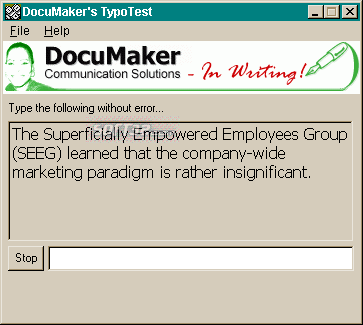 We believe a test that incorporates symbols, numbers, and letters together is a much more accurate method of assessing typing skills since we encounter the combination of these characters more often than not. Rarely do we type only words, or symbols, or numbers (except as in data entry). That's why you'll find DocuMaker's TypoTest more applicable to real-world typing and skills assessment.
