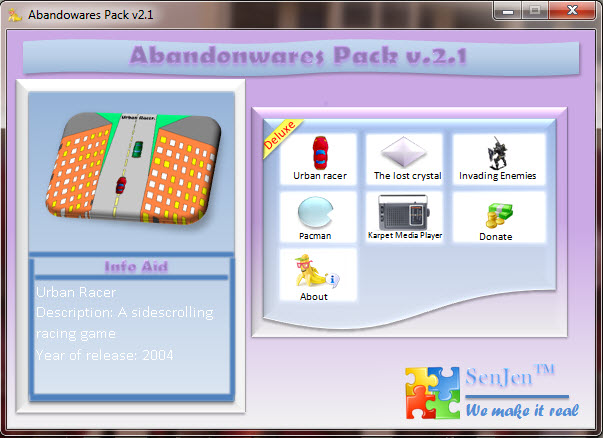 Abandonwares pack v.20 contains some of our old abandoned softwares made over decades ago. This pack houses six of our abandoned softwares. Namely: 1) The lost crystals: An adventure, RPG (role playing game). 2) Pacman 4) Karpet Media Player: A media and CD player with neat graphics. 5) Invading Enemies: An adventure game with a character sent to destroy the forces of evil. 6) Urban Racer: A side scrolling racing game. Abandonwares are softwares which we can hardly remove from our software database because, our users still enjoy using them. These softwares include earlier versions of some of our present products. Our abandoned softwares have been wrapped in a setup. This pack is therefore a tribute to our old but useful software products. Enjoy!