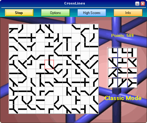 This game is a variant of the well-known game LINES. Elements on the game field must be arranged in such way, that closed contours must be formed. The user can rotate elements by pressing the right button of the mouse. The game has two modes: "Classic Mode" (new elements appear after each move of player) and "Time Race" (new elements appear in equal time intervals).