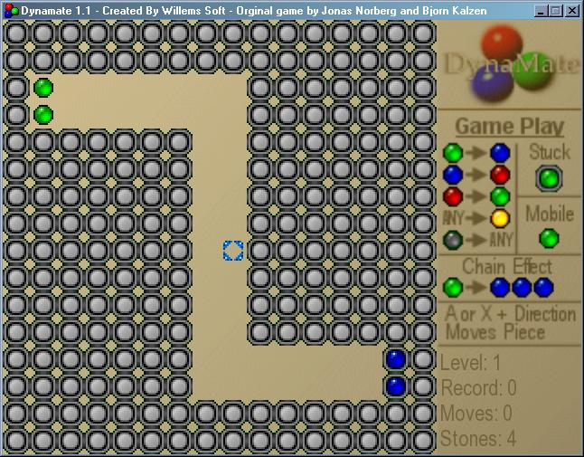Dynamate is a game originally made by Bjorn Kalzen and Jonas Norberg. It is a puzzle game where you have to try to remove colored pieces from the playfield by letting them collide with another specific colored piece. There are pieces that are stuck to the playfield, moveable pieces and special pieces like color changes, direction rotators, teleporters, ... The game can have upto 25 of custom OGG/MOD music files, has a built in level editor and support for joysticks.