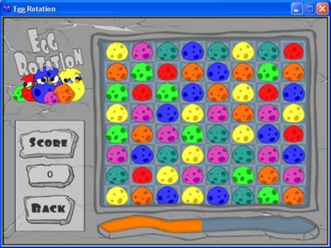 Rotate eggs to make a link. Link some eggs to make eggs fall. The objective of Egg Rotation is simple. Link 3 eggs or more of the same color to score points. The more eggs you link, the more points you score. Click on any 2 eggs which are adjacent to one another, horizontally or vertically, to switch their positions. If the action results in 3 eggs or more of the same color making a link, the eggs disappear. Eggs above fall down.