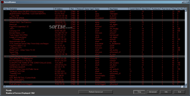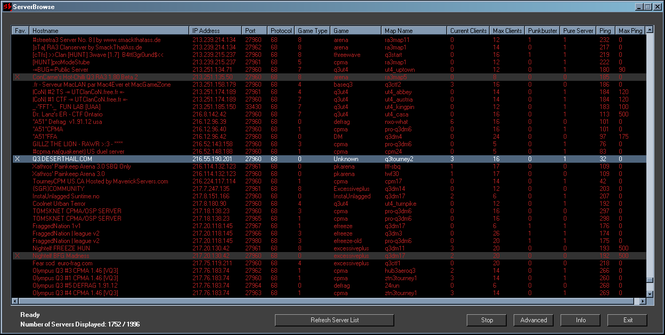 ServerBrowse is a Quake III Arena Server Browser and game launcher with a clean, modern interface. Features include the ability to sort available servers by any parameter, such as ping time, map name, hostname, game type, IP Address, port, connected clients, max clients, punkbuster enabled, pure server enabled, max ping, etc., the ability to launch Quake III Arena directly into the server of your choice with a simple double-click or press of the 'enter' key, the ability to mark servers as favorites, adjustable color schemes, and adjustable advanced features such as threading parameters, timeouts, display update intervals, game launch options, etc. ServerBrowse is FREEWARE. It contains absolutely no adware, spyware, virii, or trojans.