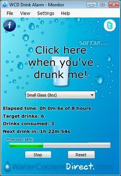 Experience the numerous health benefits of being hydrated with this new, handy app. Simply enter your weight, the amount of exercise you will be doing and set the number of hours that you will be monitoring your water intake and the app will calculate how much you need to drink throughout the day, and remind you when.You can also select the vessel (e.g. 300ml bottle) that you will be drinking from in order to get an accurate measurement of how many glasses or bottles you need to drink. Plus if you are ‘on the go’ you can change the type of vessel at any time and the app will cleverly re-calculate and update how many glasses or bottles you need to drink. The Drink Alarm app will alert you regularly with a pop up and by sounding an alarm to remind you to drink more in order to reach your daily target.