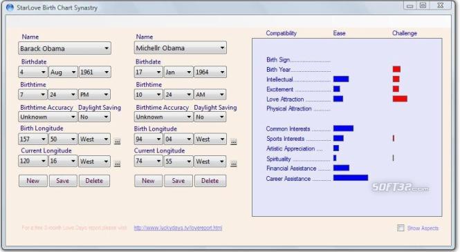 StarLove Birth Chart Matching software for lovers and friends. This software compares the birth charts of two people and indicates the easy and challenged areas in their relationship. Torn between two lovers? Let StarLove help you find the more compatible partner! StarLove Birth Chart Compatibility software now has a Love Days module that indicates the best recommended days to meet with others, communicate, have fun, romance and be intimate with your partner. StarLove calculates the aspects made by the planets in the birth charts of each person to calculate their compatibility. It also compares their "progressed" birth charts to calculate current compatibility. StarLove is an easy-to-use and accurate way of finding out how compatible you are with others as well as suggesting days when planetary activity is in your favor to enhance and make the most of your relationships with others.