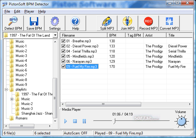 There's no risk to ruin your master plan if you use Pistonsoft BPM Detector! This free audio tool scans your entire collection of songs and detects the number of beats per minute, which gives an idea of how calm or how energetic the tune is. Pistonsoft BPM Analyzer can display the numbers right away in its convenient browser-style interface, but most prefer this information saved as a tune's meta-tag. You'll end up having all of your MP3s with ID3v2 tags that contain BPM numbers - easy to access and show by your favorite jukebox!