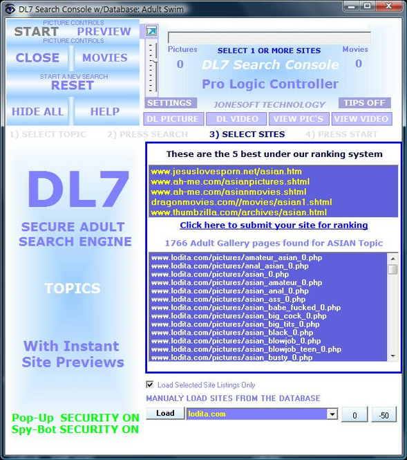 DL7 Scanning Search Engine, Secure Viewing of High Risk Sites. Scans Gallery Sites and returns the Free Daily Picture and Video Previews.No-Popups, No Spy-bots 100% Safe High Risk Sites Search Program. Fully Trusted Jonesoft Program, works on All Windows OS Platforms. You can also retrieve files from your favorite high risk content sites and stop all the problems visiting these sites with a web browser can cause. We provide a listing of millions of web pages that contain preview content of a quality standard set by us. You will receive the finest images and videos available on the web. Similar Software