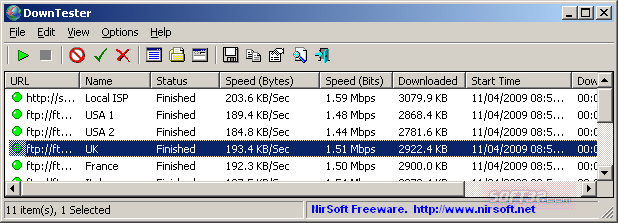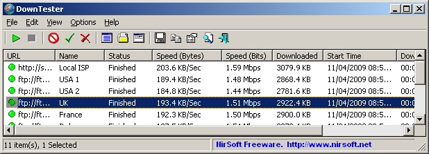 DownTester allows you to easily test your Internet download speed in multiple locations around the world. It automatically test the download speed of the URLs that you choose, one after another. It moves to the next download URL after the specified number of seconds has been elapsed or after it downloads the specified amount of KB - just according to your preferences. After the download test is finished, you can easily save the result into text/html/xml/csv file, or copy it to the clipboard and paste it into Excel and other applications.