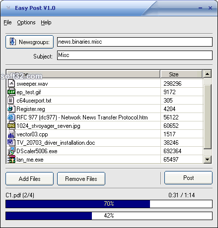 Post many files at once on newsgroups in yEnc format. Easy to use, unlimited number of files to post, ability to stop and resume posting, automation. Drag and drop support, sorting files by name, size, ascending and descending and then posting in that order. Automatic file naming, automatic file splitting for multi part posts. Free. Similar Software